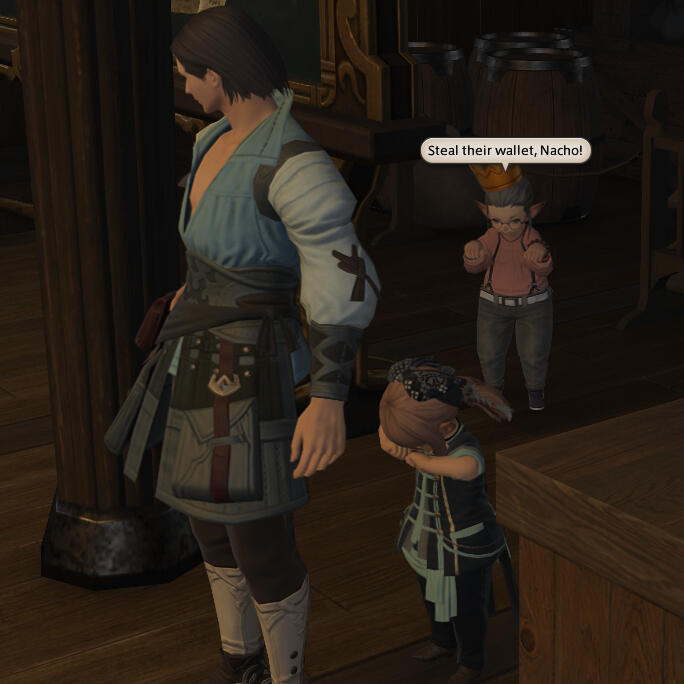 Chaon got into some trouble in Ul'dah when he picked the wallet of a influential merchant and ended up in gaol. The agreements for his release was a court appointed watcher, Hana Murasaki to prevent him from stealing more wallets.